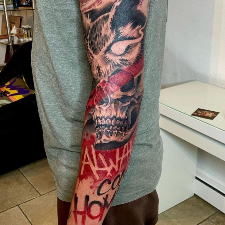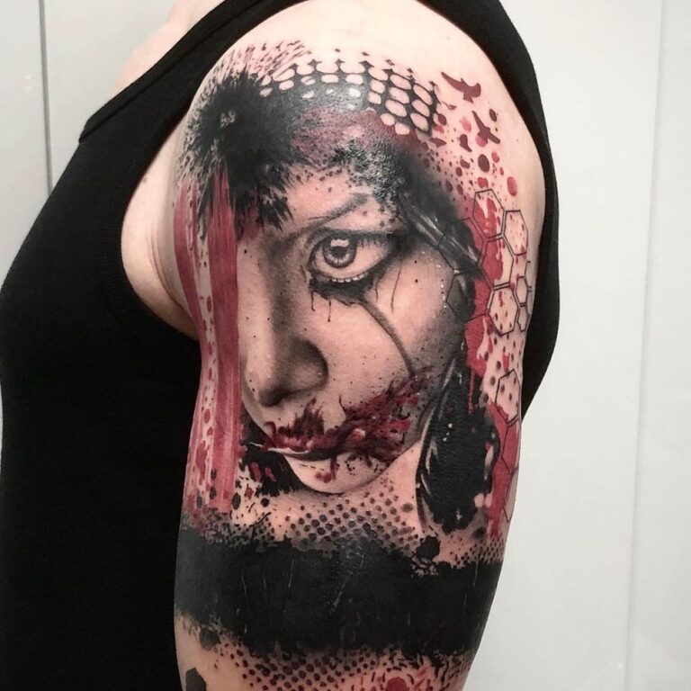 The trash-polka tattoo style is defined by its avant-garde and collage-like aesthetic. Combining chaotic elements with precise details, this style often features bold black and red colors, distressed textures, and graphic symbols. Trash-polka tattoos draw inspiration from diverse sources, including fine art, graphic design, and punk culture. Characterized by a raw and rebellious vibe, our expert team of tattooists will utilize this style to create visually intense and dynamic body art that stands out for its eclectic blend of elements, realizing a bold statement on your skin.