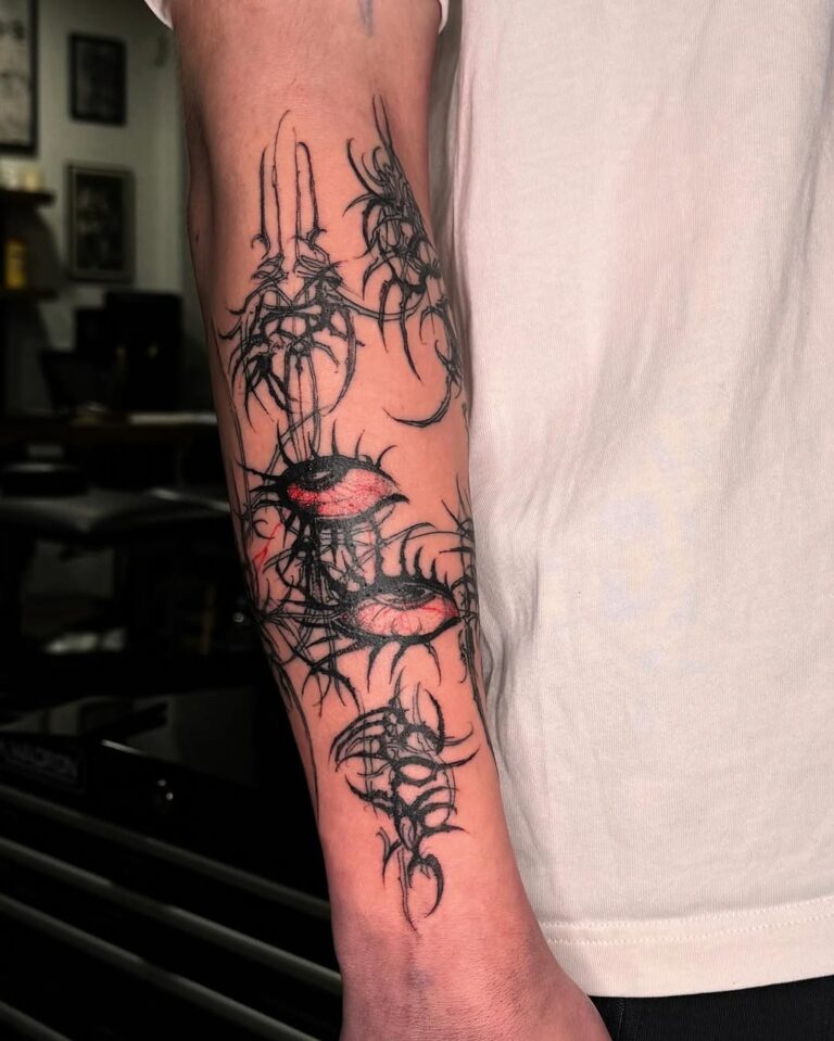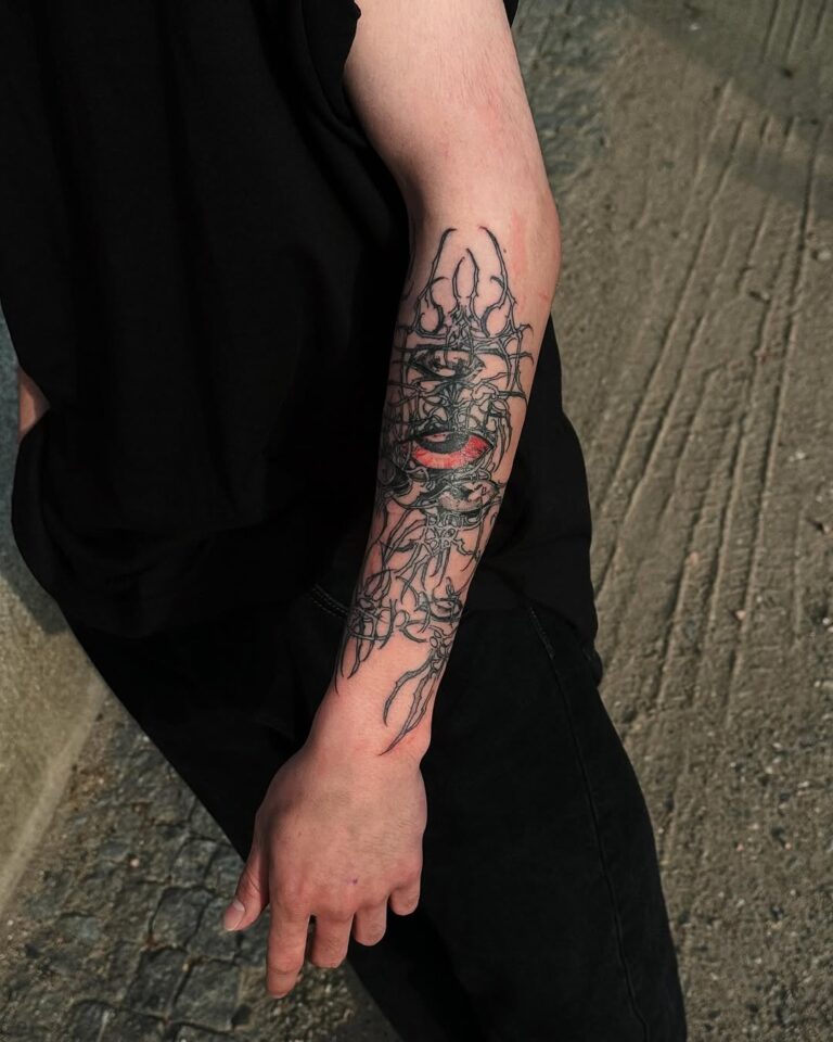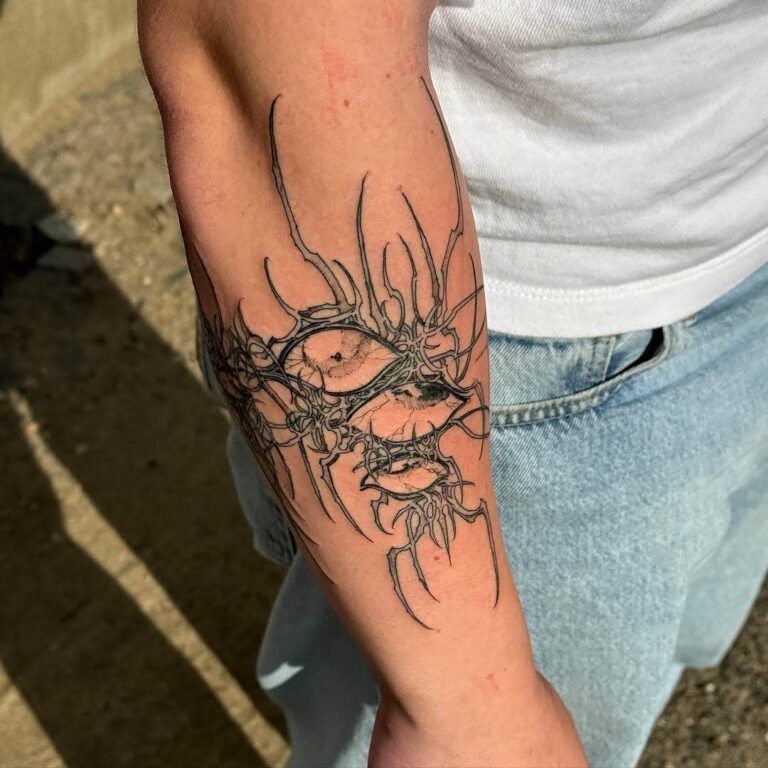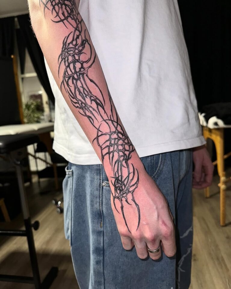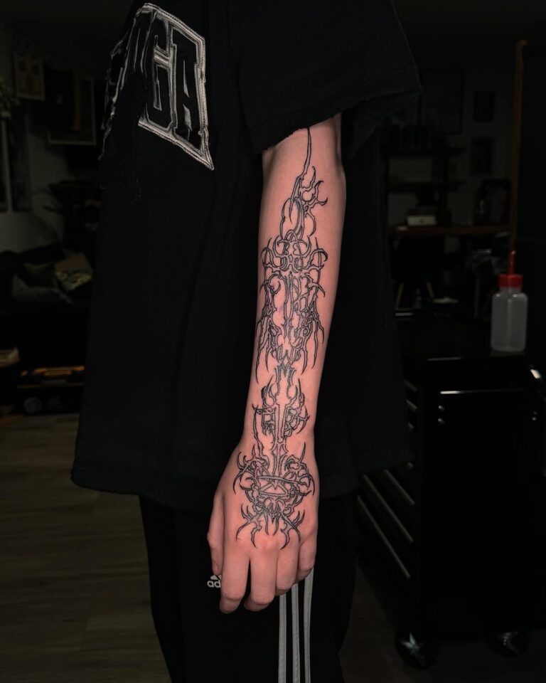 This style thrives on its ability to blend the mystical with the mechanical, resulting in tattoos that feel otherworldly yet deeply personal. Often rendered in monochromatic black ink, cyber-sigilism tattoos are highly detailed, with sharp contrasts and innovative compositions that push the boundaries of traditional tattoo artistry.